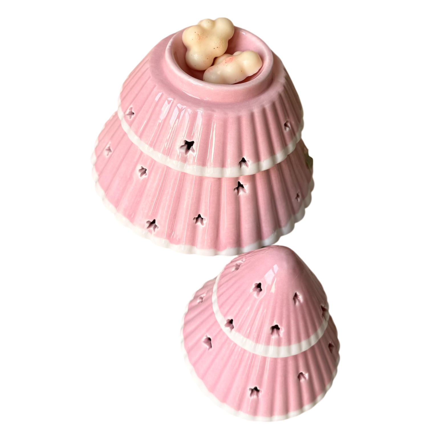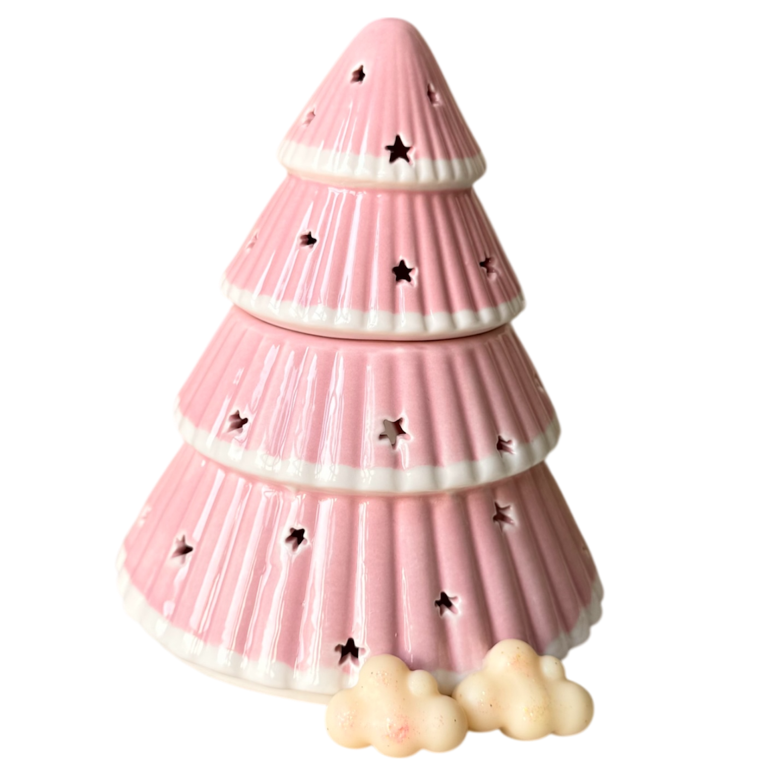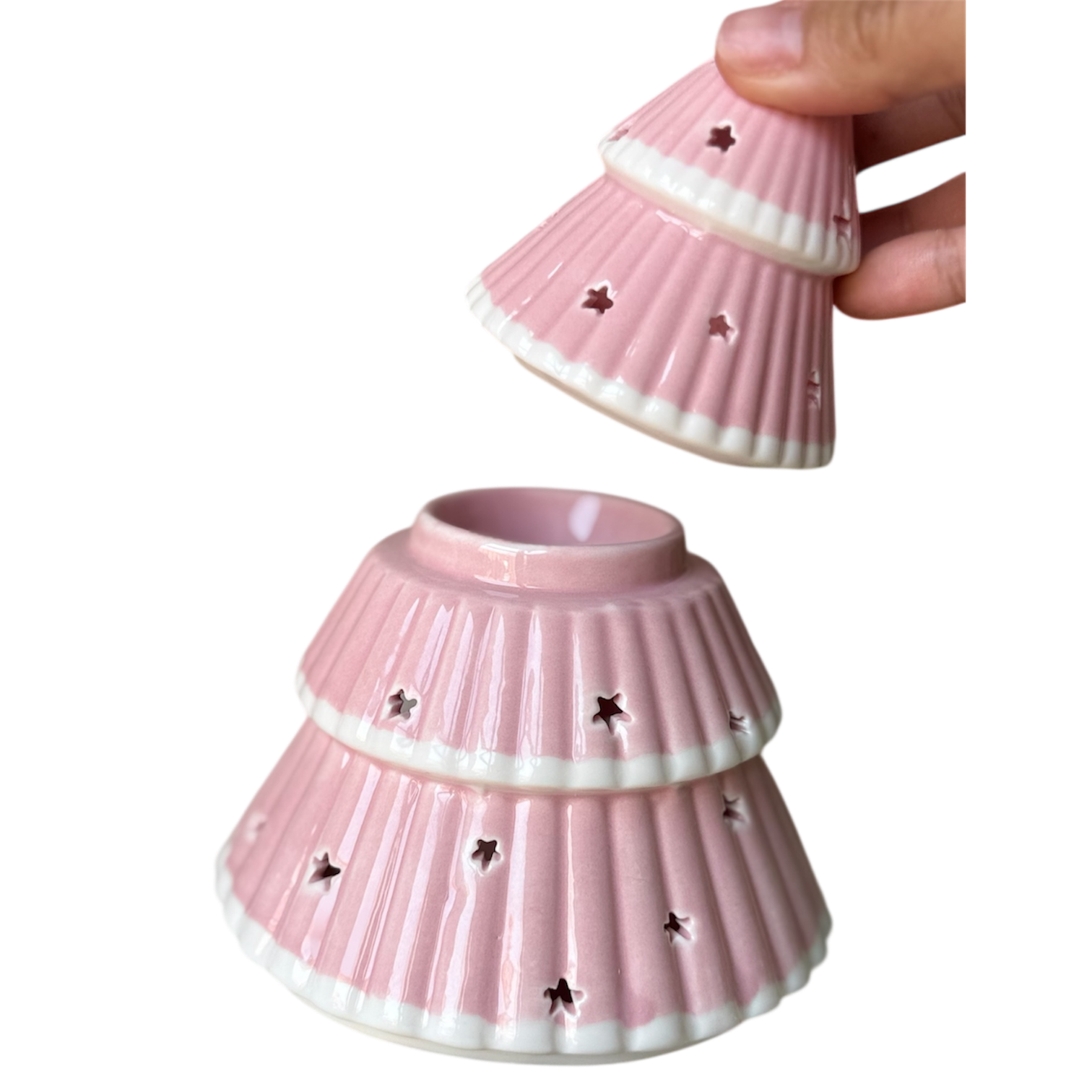 Un toque mágico para tu Navidad: quemador en forma de árbol rosado con mini estrellitas que dejan pasar la luz de la vela.