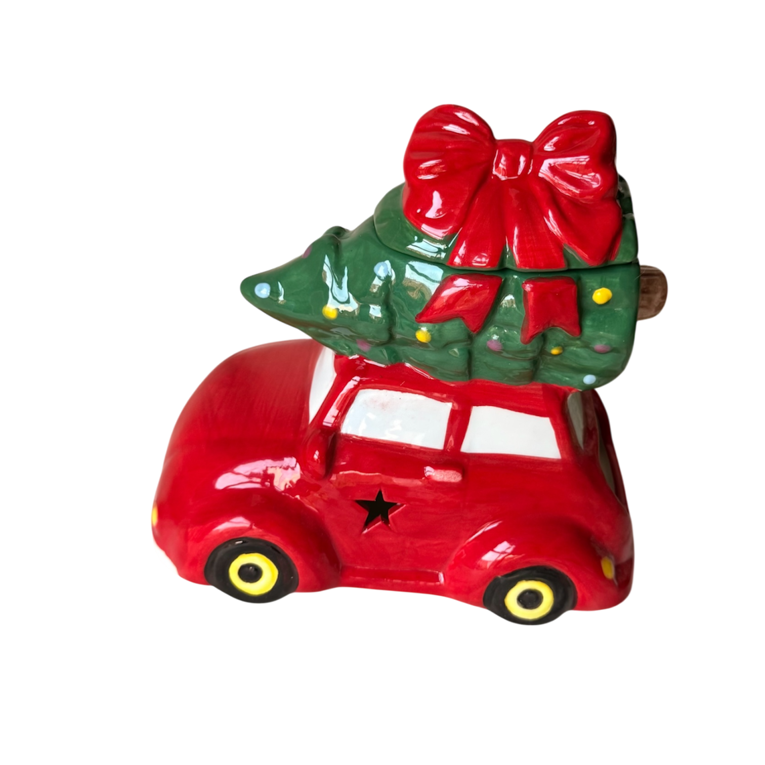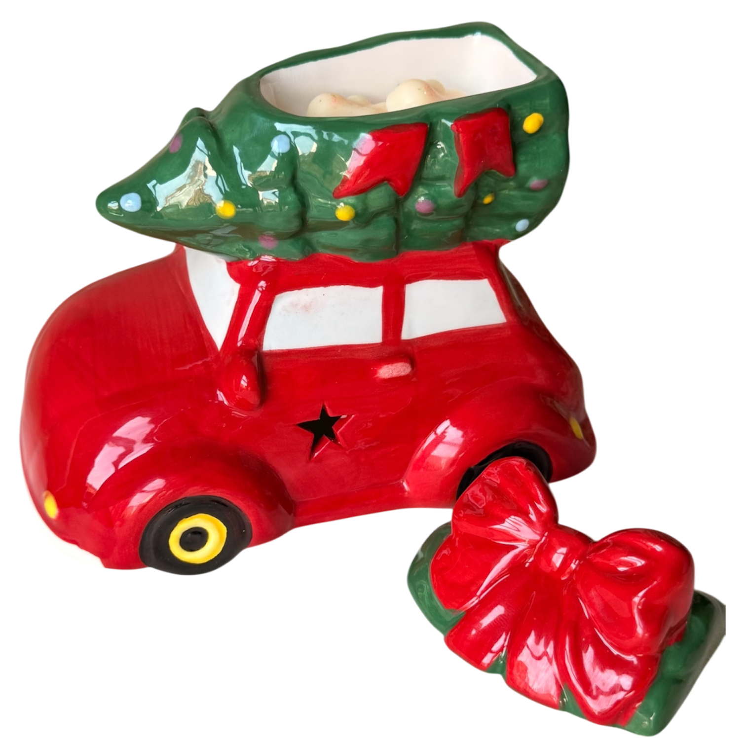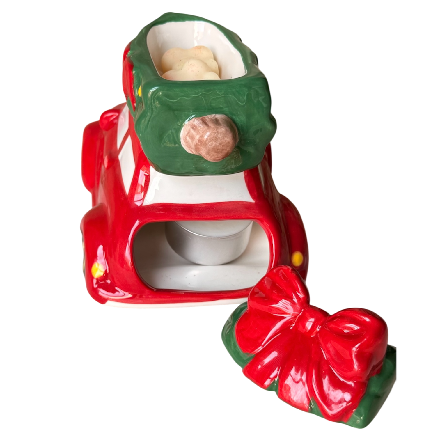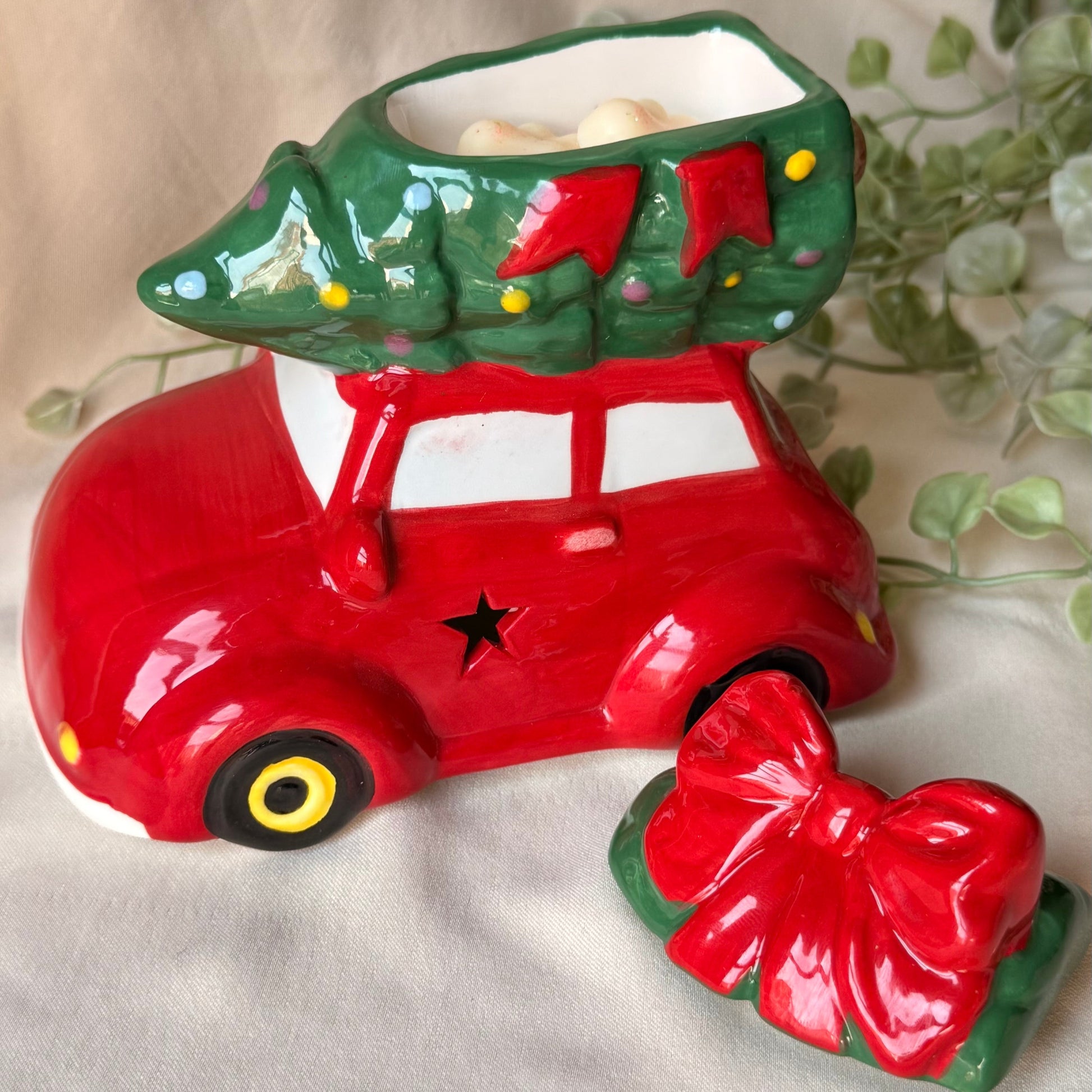 El encanto de la Navidad viaja contigo en este adorable quemador en forma de coche navideño. Decorado con un arbolito en la parte superior y un lazo rojo festivo, es un homenaje a esos momentos entrañables de volver a casa por Navidad.